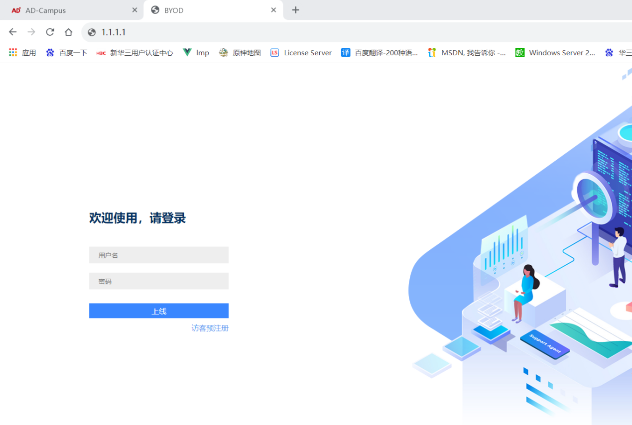 另外,如第一次认证未弹出图1界面,苹果设备可在连接网络后打开任意浏览器输入http://1.1.1.1即可弹出图1认证界面。