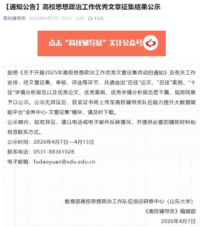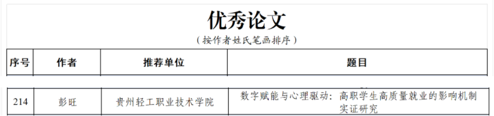 近日,教育部高校思想政治工作队伍培训研修中心(山东大学)、《高校辅导员》编辑部公布了2025年高校思想政治工作优秀文章征集活动评选结果。建筑工程系辅导员、黔中心苑辅导员工作室主持人彭旺撰写的论文《数字赋能与心理驱动:高职学生高质量就业的影响机制实证研究》获评优秀论文