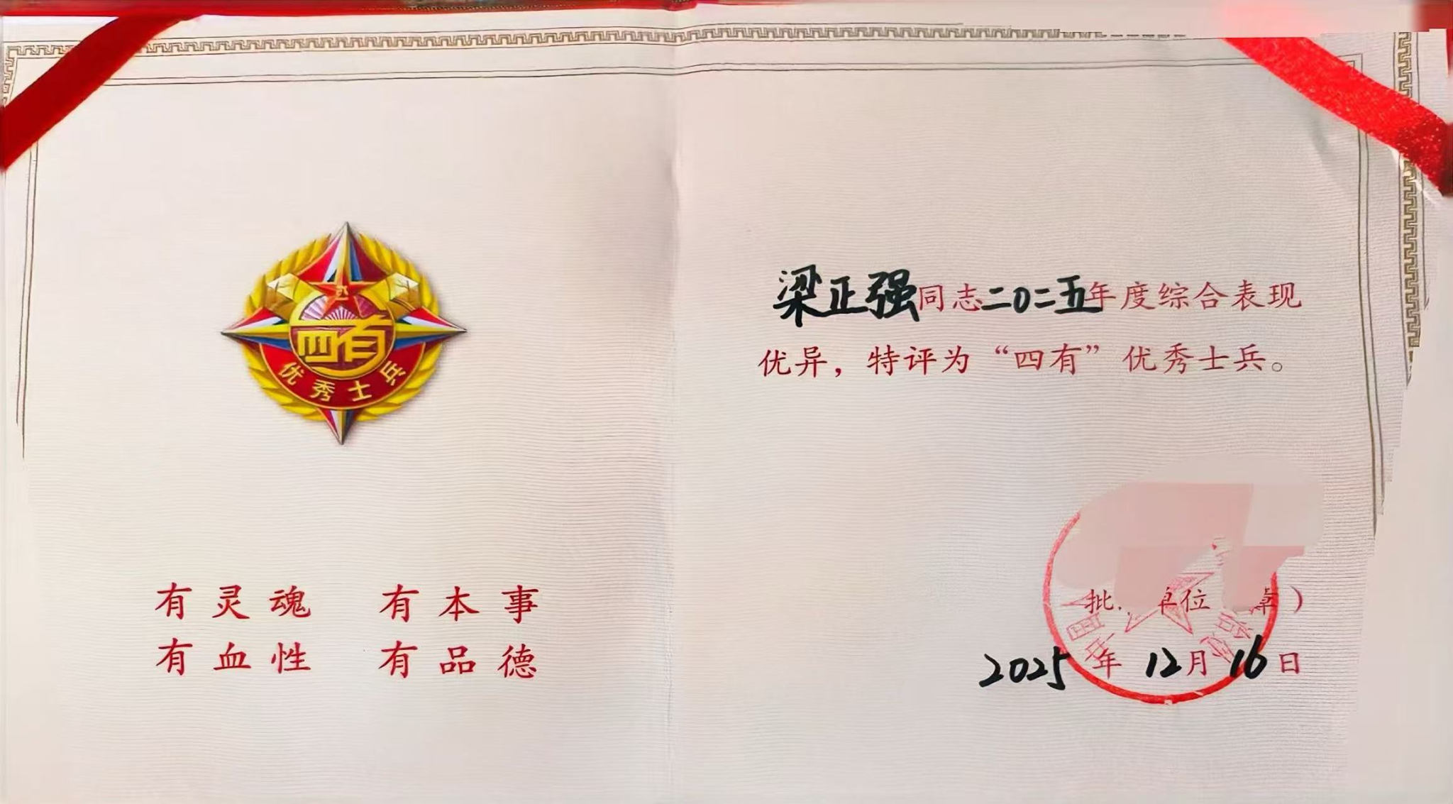近日,学校收到中国人民解放军某部发来的喜报,机电工程系2021级新能源汽车技术2班入伍士兵梁正强同学在部队服役期间表现突出,荣获2025年“四有”优秀士兵荣誉称号。