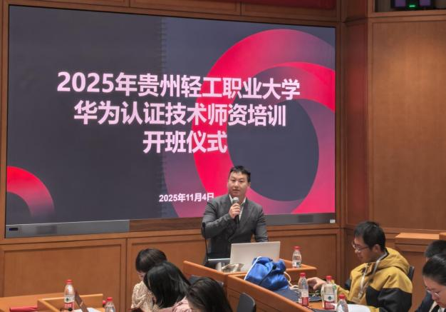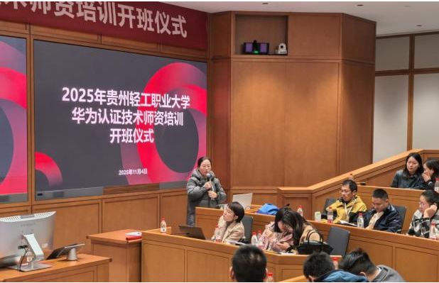 开班仪式上,王珂佳副院长发表致辞。他强调,本次培训是学校推进“双师型”教师队伍建设的关键举措,对提升人才培养质量具有重要意义,希望参训教师精准把握技术变革机遇,将前沿技术融入教学创新实践。教师代表冯丽霞作表态发言,她表示,全体参训教师将珍惜此次学习机会,潜心钻研华为前沿技术,全力推动技术成果与课堂教学深度融合,为贵州数字经济发展培育高素质技能人才。华为孙文翔总监表示,华为将持续深化与学校的校企合作,推动先进产业资源向教育体系高效转化,共同构建贵州ICT人才培育生态。博海迪徐涛总监就本次培训的课程体系设计、教学实施流程及保障措施进行了系统介绍。